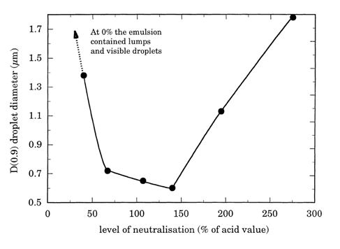 نکته بسیار مهم این است که حتماً امولسیفایر باید قبل از آب به رزین آلکیدی اضافه شود. یکی دیگر از پارامتر بسیار مهم برای وارونگی فاز، درجه خنثیسازی رزین میباشد. نتایج تغییر درجه خنثیسازی رزینهای الکیدی کوتاه روغن و اثر آن بر روی قطر قطره امولسیون، pH و ویسکوزیته در زیر نشان دادهشده است.