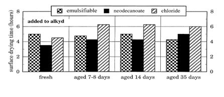 از این نمودار مشخص میشود کبالت نئودکانوات باعث خشک شوندگی سریعتری میشود. در کل عملکرد هر سه مشابه میباشد. در امولسیون آلکیدهای متوسط و کوتاه روغن اگر کبالت به فاز آب اضافه شود، ممکن است نفوذ به قطرات آلکیدی ویسکوز در طول تشکیل فیلم دشوار شود؛ پس کبالت به فاز آلکید اضافه میشود.
